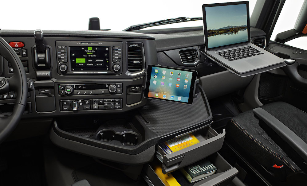 • Electronic handbrake (option):   A new option, Scania’s electronic parking brake is pressure sensitive, which means it can be applied gradually.  As the parking brake is electrically controlled, it can also be equipped with new functionality. One example is a smart safety feature which sees the brake applied if the speed is low and the driver releases the safety belt or the door is opened.