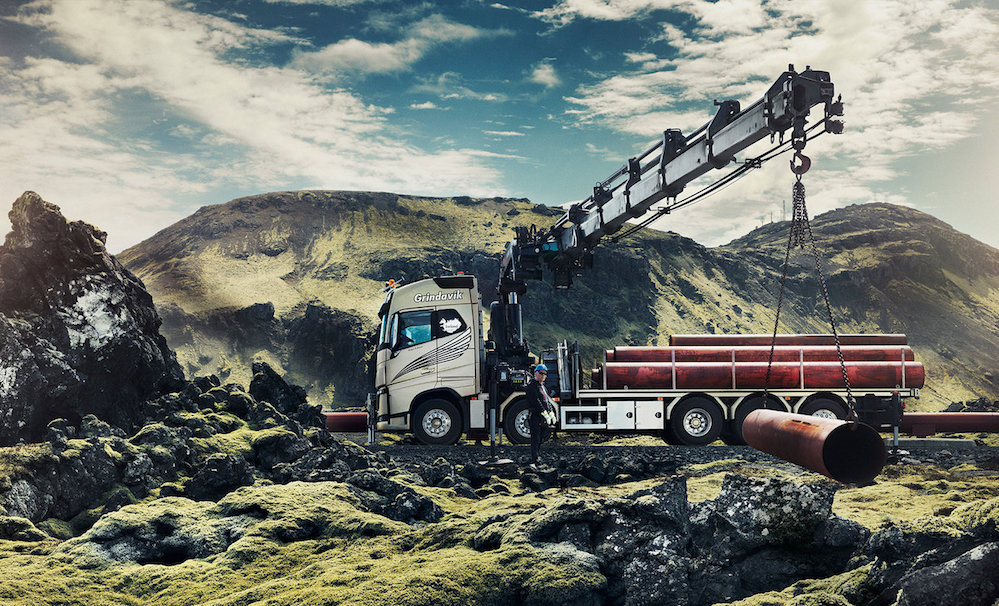In Iceland, haulier Jón og Margeir EHF is involved in an ambitious geothermal project that ensures that the country’s inhabitants have hot water for domestic heating. Its Volvo FHs with 38 metre cranes have proved especially useful for the transportation and installation of new pipelines.