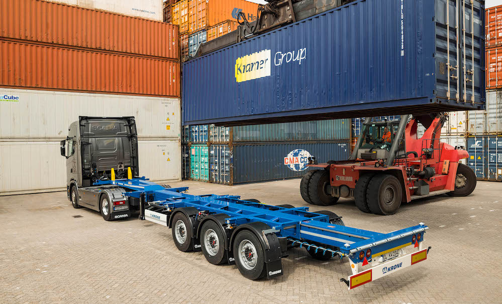 Schmid requires a hard-working and reliable container carrier with flexibility and easy loading for its demanding, pick-up-and-drop, sea container and swap body service and so selected two versions of Krone’s Box Liner for the job: The Box Liner eLTU70 and Box Liner eLTU4.
