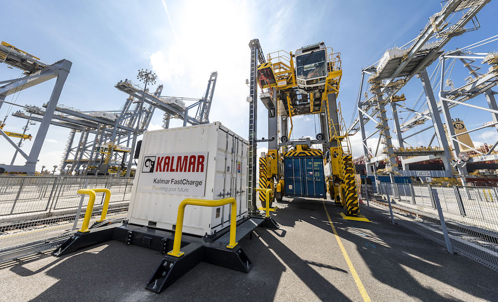The project involved the conversion of one of the terminal’s existing Kalmar hybrid shuttle carriers into an electrically powered FastCharge shuttle carrier. The modification work itself was completed in just a few weeks. Kalmar FastCharge is based on the same opportunity-charging technology used in electric buses, with charging taking place during the idle time in the shuttle carrier’s working cycle. Onboard charging is supplemented by regenerative systems that store energy generated by braking and spreader-lowering operations.
