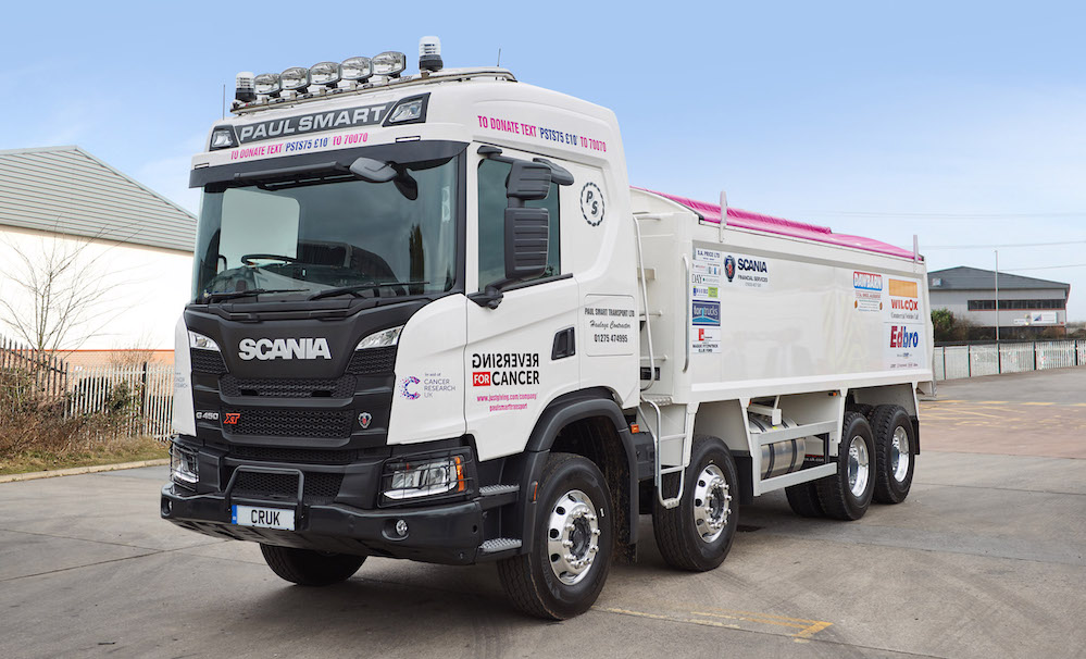 It is now 12 months since Bristol-based Paul Smart Transport Limited launched an ambitious fundraising activity to raise £250,000 for Cancer Research UK.  Known as ‘Reversing for Cancer’, the initiative’s primary marketing and awareness tool is a new generation Scania XT G 450 8X4 tipper, which has been used to raise awareness for Cancer Research UK by appearing at various truck and county shows around the country.