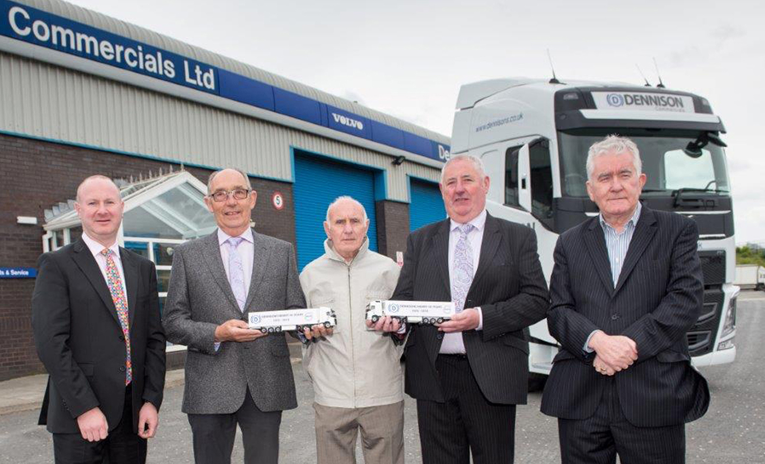 On 30th June Dennison Commercials celebrated 40 years in Newry when the current Newry Depot Manager, Malachy Martin and Dennison’s MD, John Jenkins reunited founding partners Dan O’Hare and Eugene O’Reilly with former Depot Manager Sean McCracken at the depot on Martins Lane and presented them with commemorative Volvo FH trucks and a one day only pricing event.