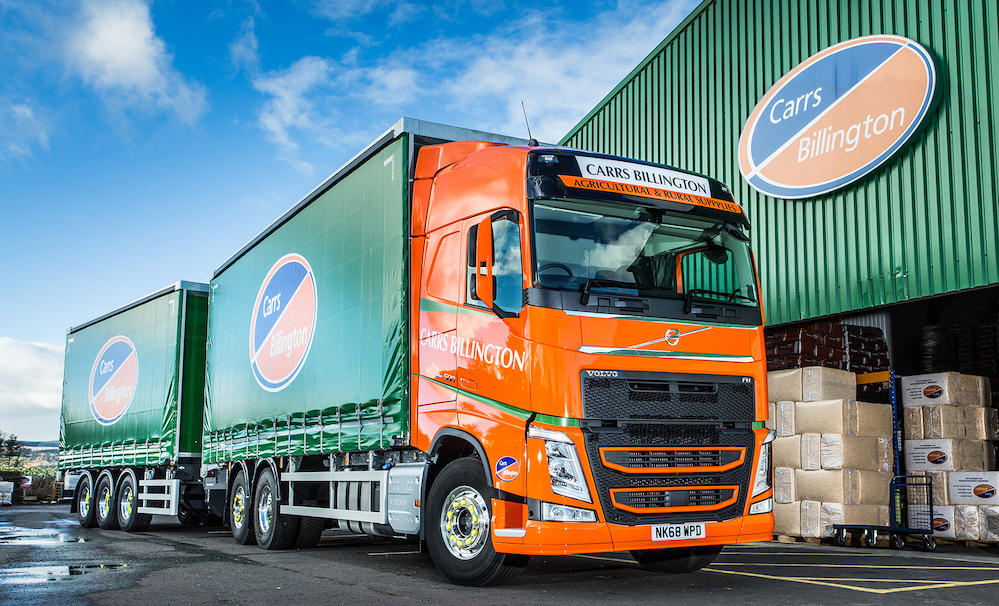 Agricultural and rural supplies specialist, Carrs Billington has put a new Volvo FH rigid and drawbar trailer into service. Supplied by Jonny Devlin, Transport Solutions Executive at Volvo Truck and Bus Centre North & Scotland, the 44-tonne FH 6×2 rigid combination willbe based at the company’s Milnathort Country Store and supply depots in Perth & Kinross.