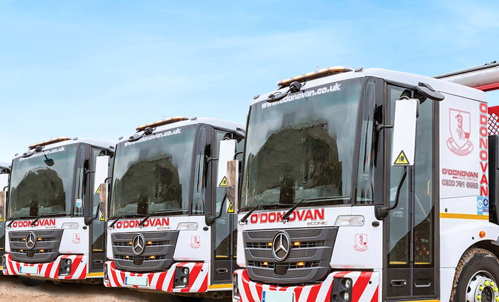 As part of its ongoing drive to raise the bar in construction logistics safety, O’Donovan Waste Disposal is proud to take delivery of the latest new additions to its fleet, making the independent waste management company the largest fleet of direct vision skip loaders in the UK. O’Donovan were also the first company in the UK to purchase the ground-breaking Mercedes Benz Econic 4×2 1830L skip loaders to their fleet in 2016. They have compounded that commitment by continuing to add the vehicle throughout 2017, and now into 2018 with the latest arrivals. Originally designed for municipal waste work, the vehicle was remodelled to be made available to service the construction sector.