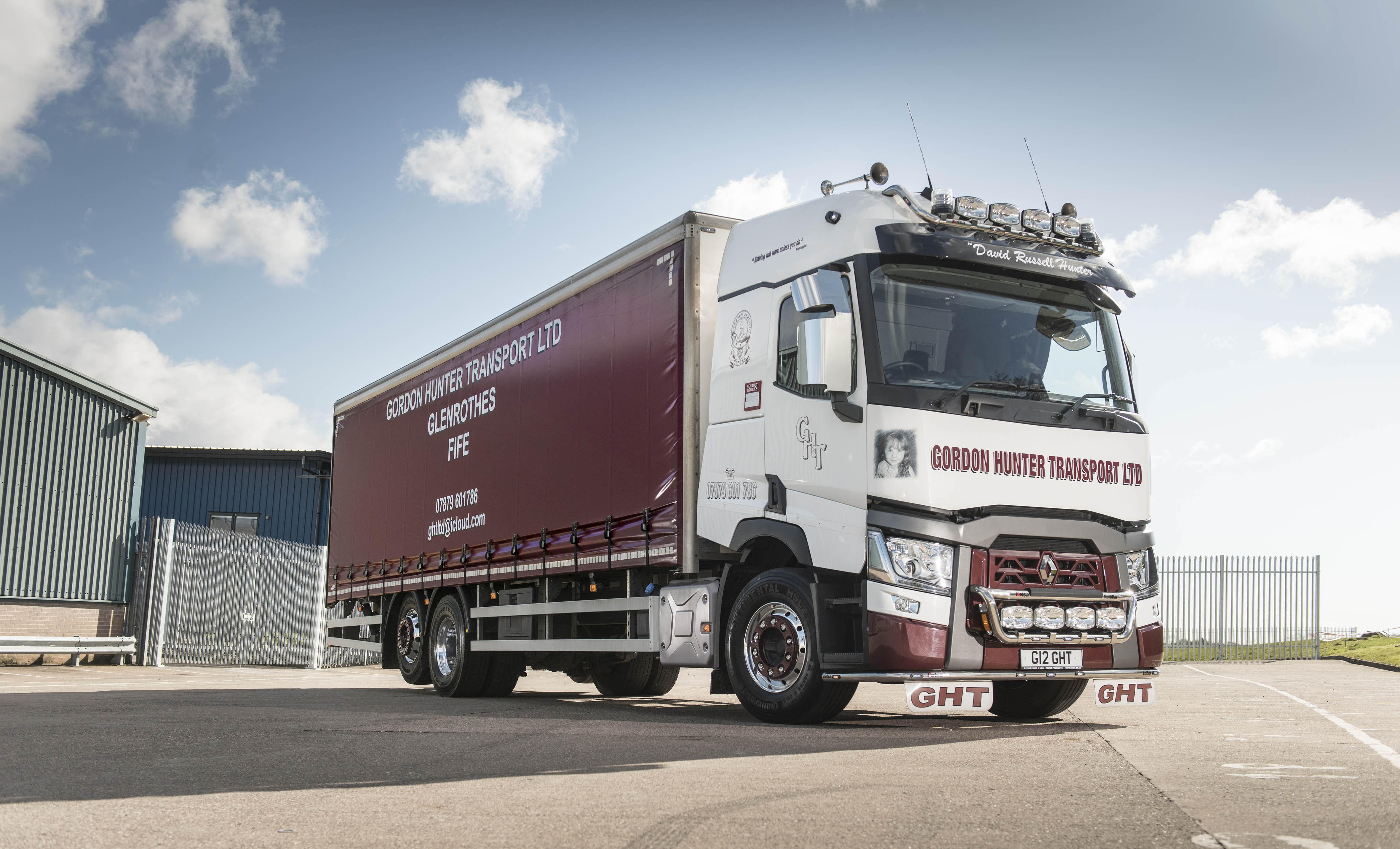 The new Range T, used for general haulage nationwide as well as palletised deliveries for shop re-fitters and wine and spirits distribution across central Scotland, has photographs of owner Gordon Hunter’s young daughters Cali and Ellie, who feature on all his trucks.