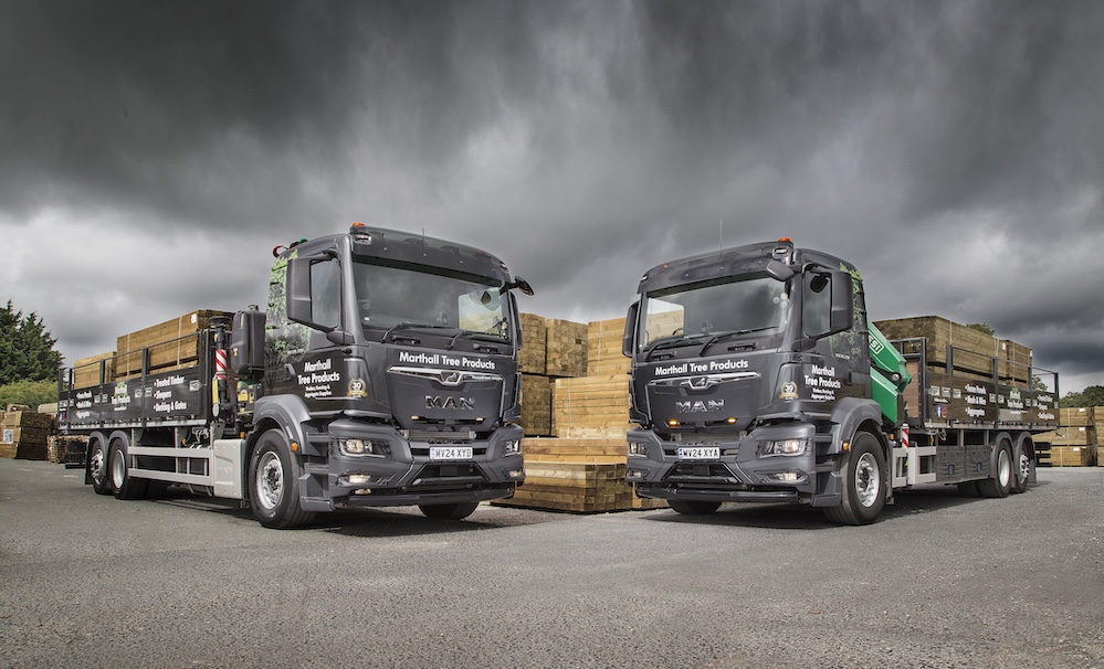 Knutsford-based Marthall Tree Products has just taken delivery of two new specialist delivery vehicles. The new vehicles, in the form of 26-tonne MAN TGS 26.330 6×2 rigids, are fitted with tailor-made bespoke 7.5-metre flatbed, alloy drop side bodies.