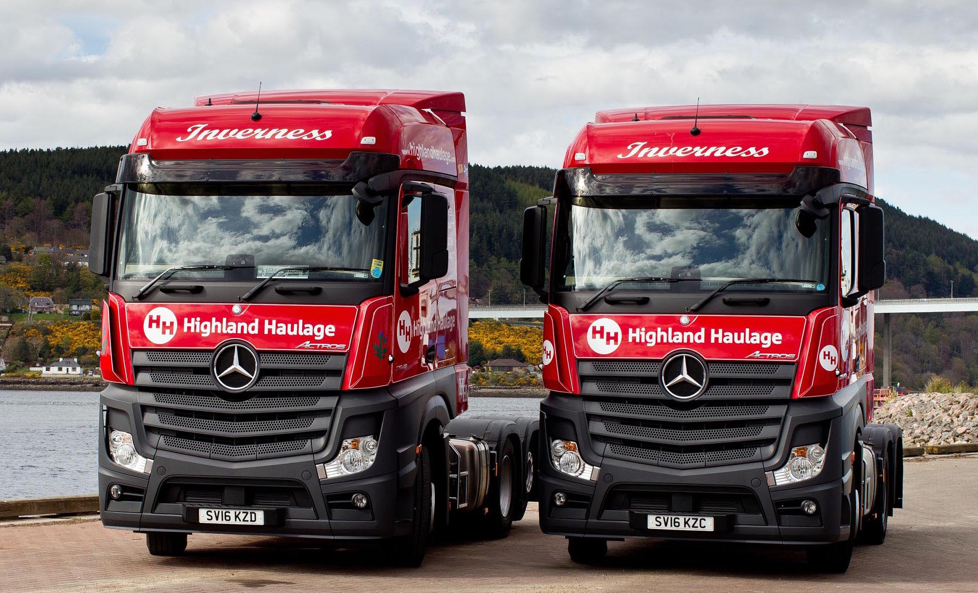 The Actros are now hard at work, double-shifted on daytime runs to Fort William on the west coast, and hauling bulk materials from local factories to Inverness harbour at night.