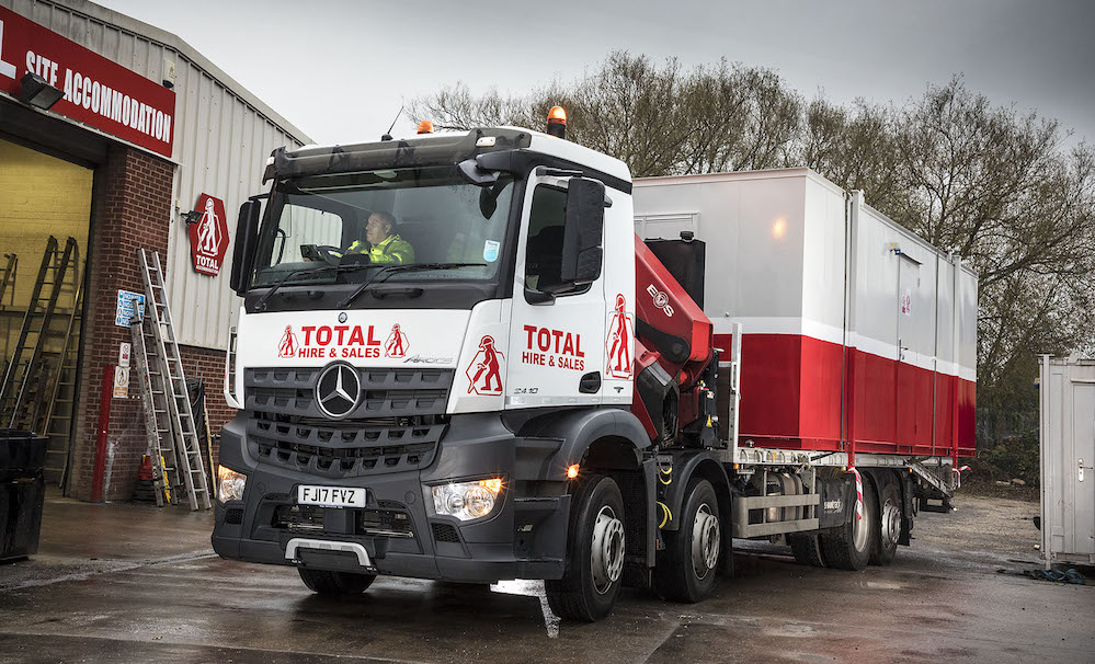The Arocs is based at Total Hire & Sales’ dedicated site accommodation branch in Little Eaton, Derby – in addition to cabins up to 24 ft long, the firm’s portfolio includes canteens and welfare facilities.