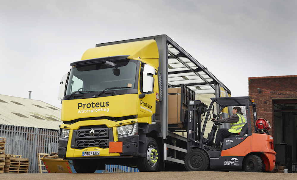 The professional and courteous approach of Renault Trucks Essex has prompted Proteus Waterproofing, one of the most innovative and fastest growing companies in the waterproofing market, to turn to Renault Trucks for its first-ever fleet vehicle – a 26-tonne Range C380 6×2 rear-steer rigid built to their detailed specification.