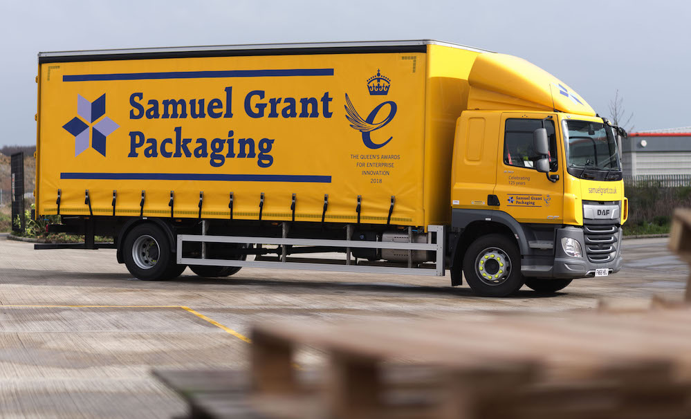 Samuel Grant Packaging has taken delivery of two DAF CF220 curtainsided trucks from Ryder with an enhanced livery that highlights their 2018 Queen’s Award for Innovation.