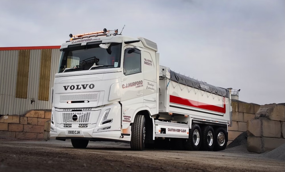 C J Hurford & Sons has taken delivery of a new Volvo FH Aero 8×4 Tridem tipper, the first truck of its kind to be put into operation in the UK.