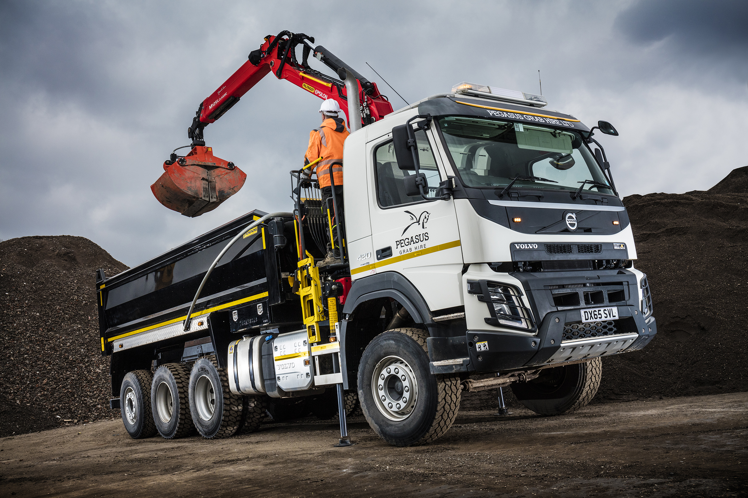 Pegasus Grab Hire of Dudley has taken delivery of a Volvo FMX 8×4 Tridem from Hartshorne Group, Pensnett. The newest addition to the company’s 12-strong – and growing – Volvo fleet represents what is believed to be not just the UK’s, but possibly the first Volvo FMX Tridem grab truck in Europe.