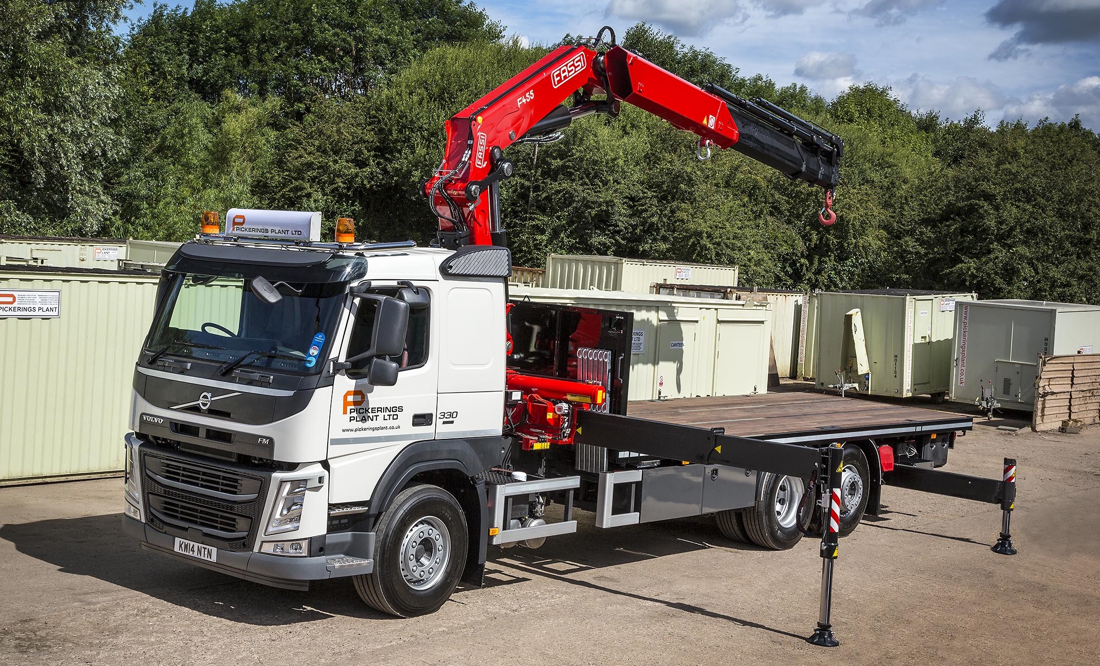 By way of contrast with the Volvo FM specified for carrying accommodation and welfare units, the truck spec for plant haulage utilises a Fassi 365, medium duty, knuckle boom crane with a 10.2 metre reach and ‘cheese wedge’ loading ramps.
