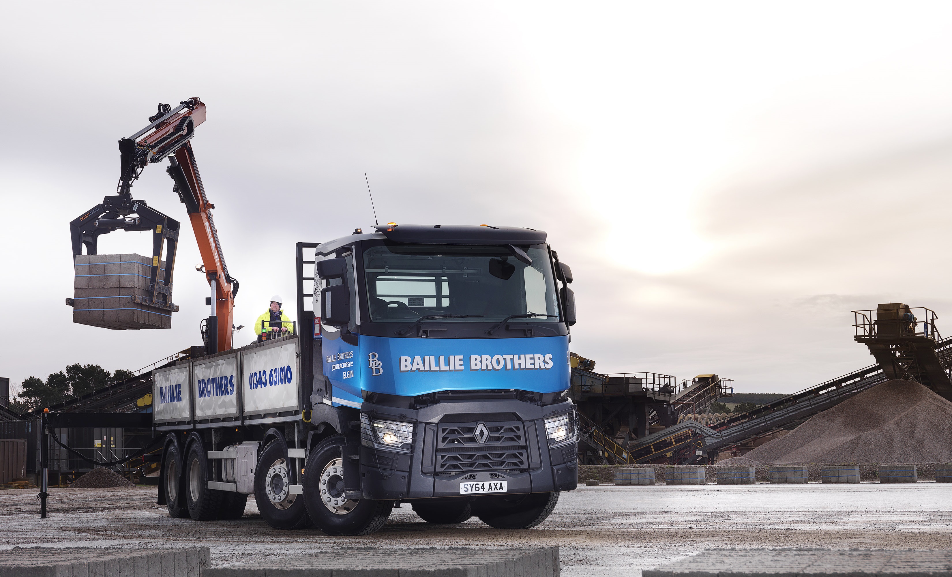 Leading Highlands haulier, Baillie Brothers (Contractors) Ltd, has opted for the new Euro 6 Renault Trucks Range C over MAN and Foden as a robust and reliable replacement vehicle. Joining Baillie Brothers’ 27-strong fleet, now over half Renault Trucks, the 32 tonne Range C430 8×4, supplied by Elgin Truck and Van Centre Ltd, is fitted with an Atlas 135.2 crane and body built by P.M.H Coachbuilders near Glasgow.