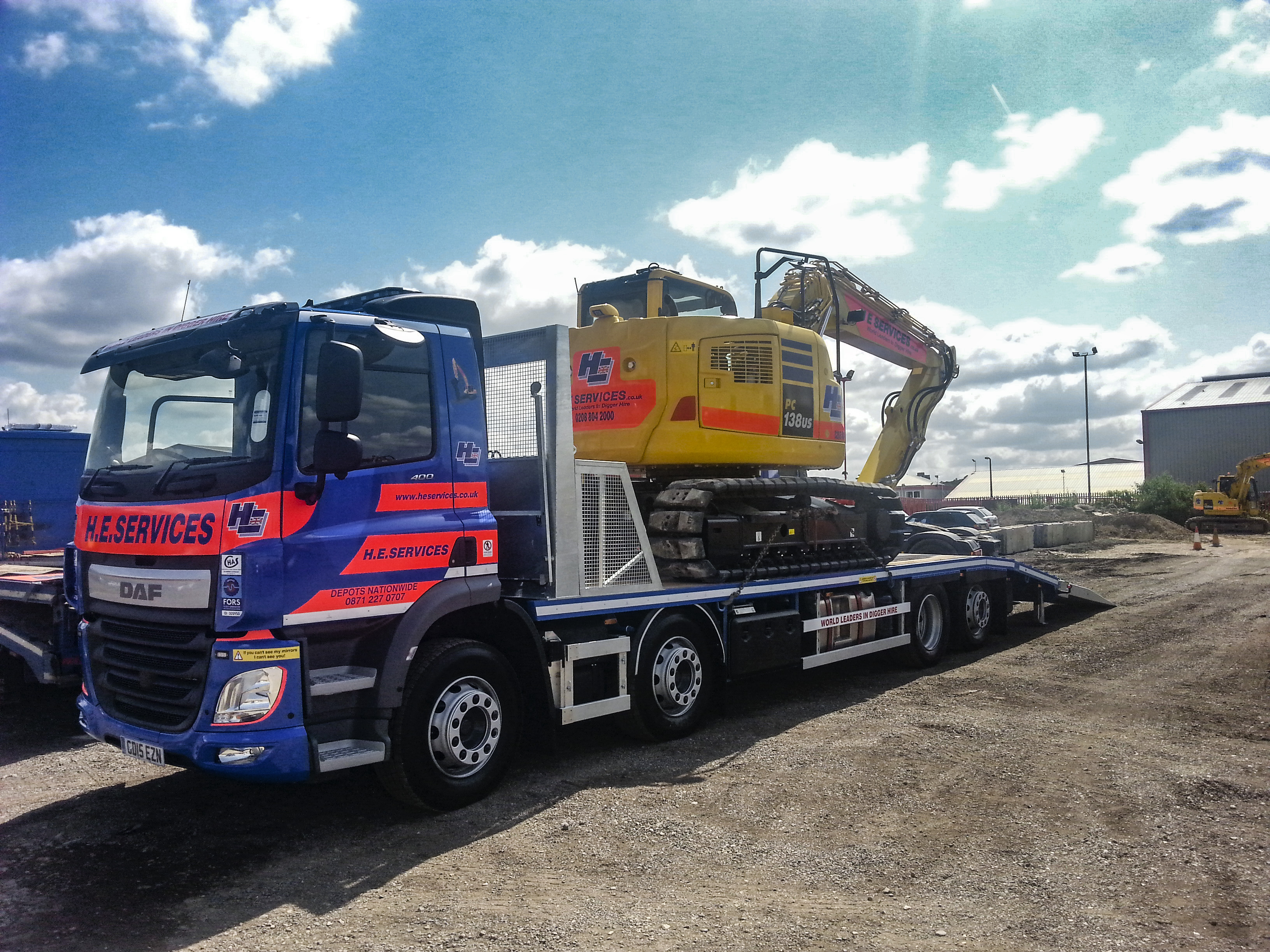 HE Services, world leaders in digger hire with 10 depots across the country and more than 3,500 items of plant available for hire, have taken delivery of new DAF CF8x2 rear steer trucks fitted with Sterling cheesewedge plant bodies. The decision reflects their ongoing commitment to maintaining their fleet to the highest standards to ensure best response time to clients.