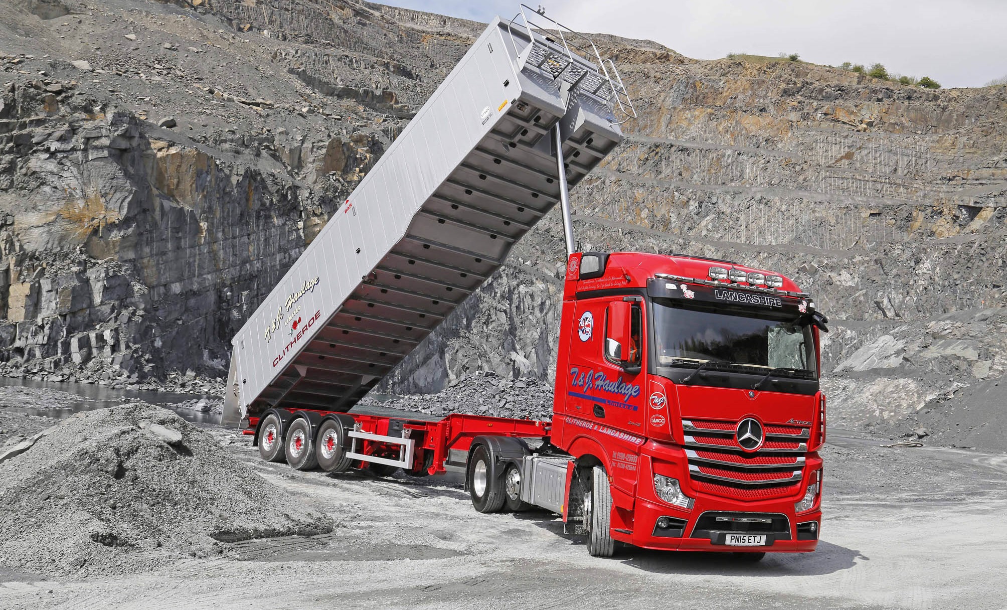 Working from the bulk tipper operator’s headquarters in Clitheroe, Lancashire, the two eye-catching Actros 2445s have aerodynamic StreamSpace cabs with Kelsa lightbars and chrome trim, and ride on Alcoa Dura-Bright alloy wheels.