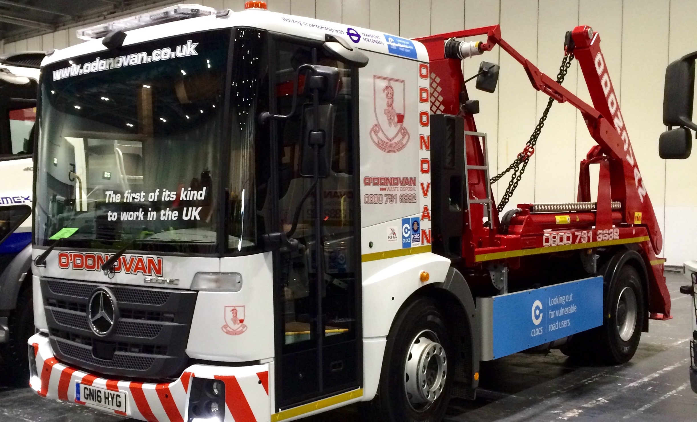 As part of its ongoing aim of raising the bar in construction logistics safety, O’Donovan Waste Disposal is unveiling brand new additions to its fleet at today’s Construction Logistics and Cyclist Safety (CLOCS) exhibition. The ground-breaking Mercedes Benz Econic 4×2 skip loader 1830L is the first vehicle of its kind to be commercially bought and put to work in the United Kingdom. Originally designed for municipal waste work, the vehicle has since been made available to the construction sector.