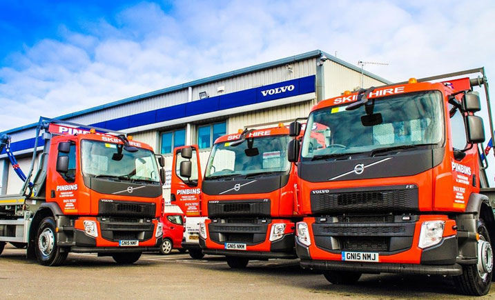 Pinbins, the Skip Hire division of Pinden Ltd. Dartford, Kent, recently took delivery of four Volvo FE, 18-tonne GVW 4×2 rigid skiploaders from Volvo dealer MC Truck and Bus.
